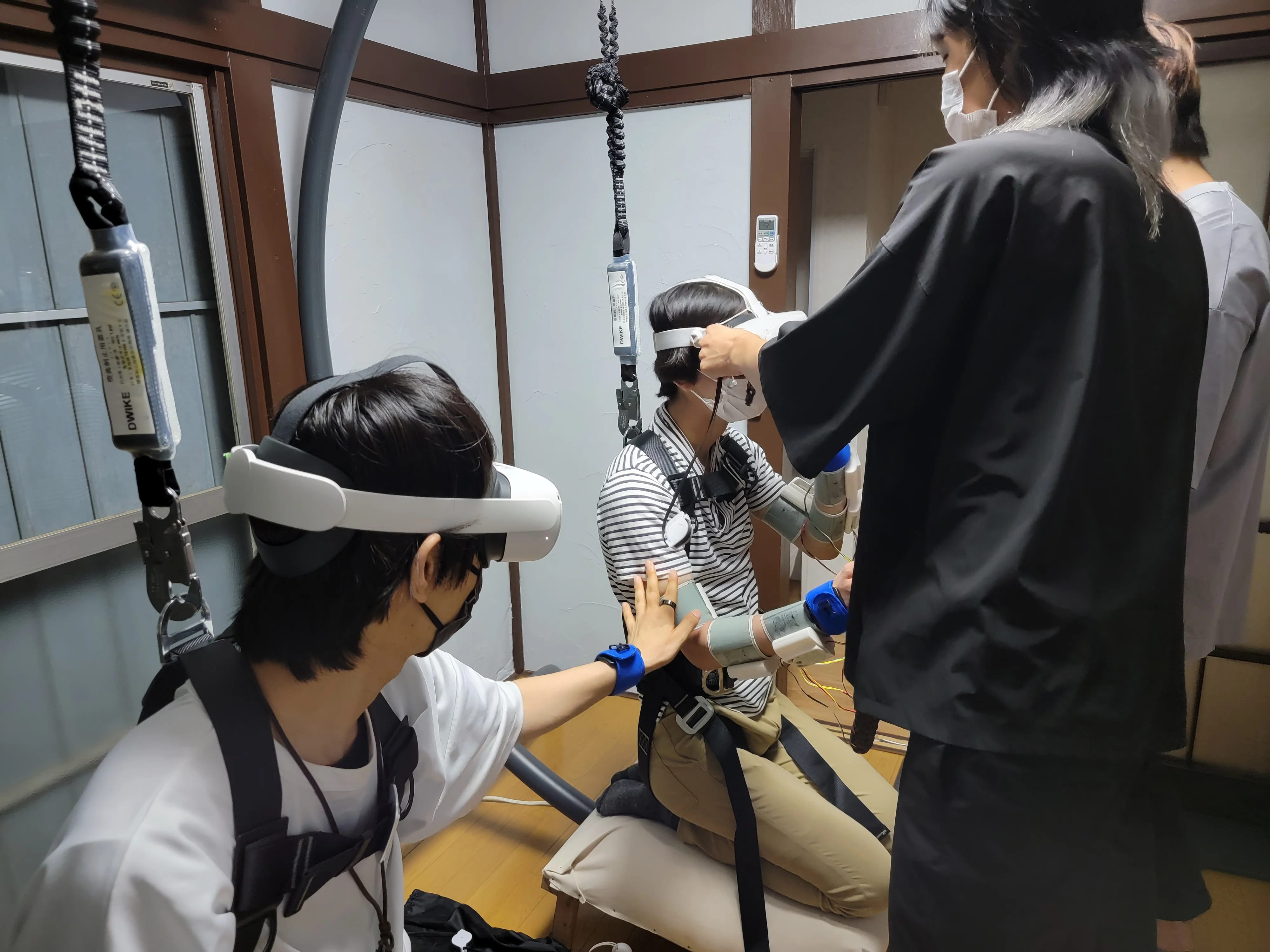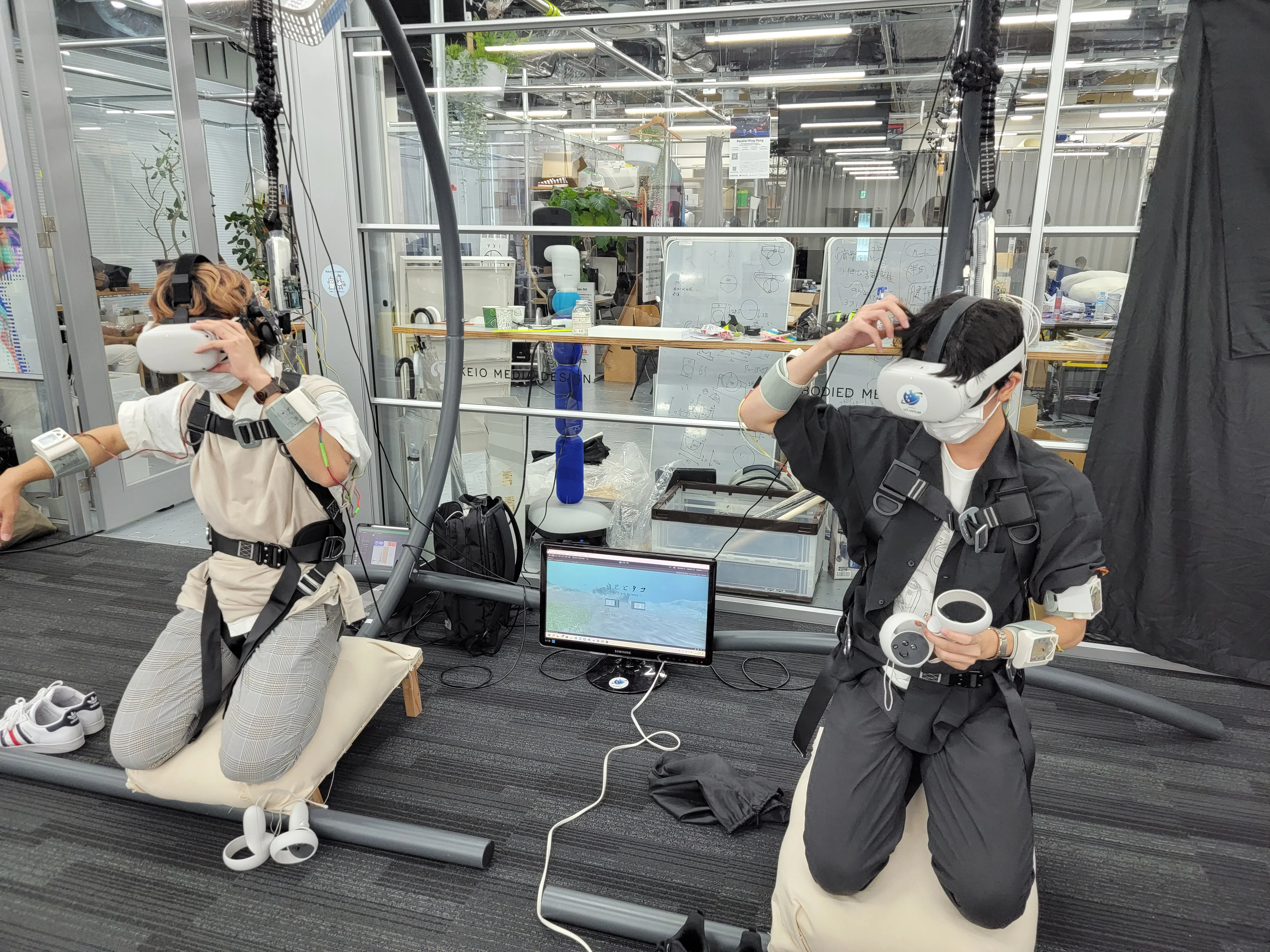 作品開発前のプロトタイピングでは、相手のアバターに身体所有感を感じるためにはどうすべきかを議論し、 最終的にタコという多脚アバターを二人で操作し、アバターの操作部位を入れ替えることで達成できるのではないか、という仮説に行きついた。